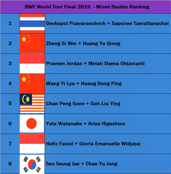 Top 8 ranked players and pairs in each of five categories (Men’s Singles, Women’s Singles, Men’s Doubles, Women’s Doubles and Mixed Doubles) who accumulate the highest ranking points at the end of the circuit will be invited to the year-end finale, the HSBC BWF World Tour Finals in Guangzhou, China.